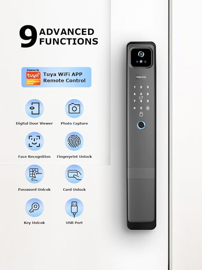 - 🔒 Multiple Unlocking Methods- This smart lock has 6 door opening methods: 3D Face recognition,Biometric fingerprint unlocking, IC card, password, mechanical key and mobile phone APP to open the door, you can also view the unlocking history through the APP. Support Tuya / Smart life APP control function, you can connect to the phone via WiFi to unlock remotely and anti-theft hijacking functions, if someone damages the lock, the lock will automatically take photos and send to your mobile APP.