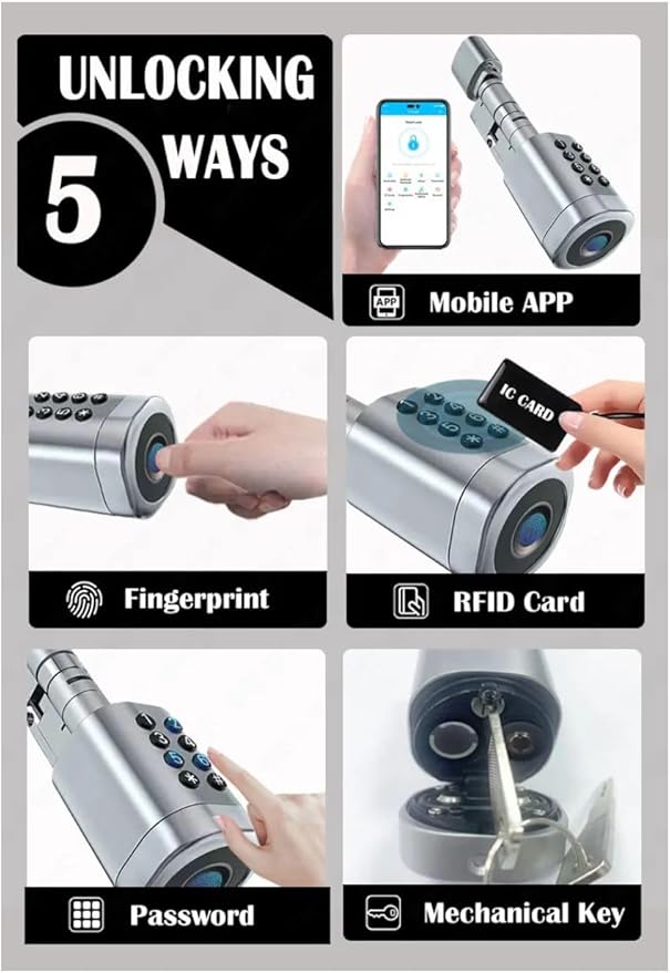 - Multiple Unlock Ways: Fingerprint ,BT unlock, APP remote unlock, card unlock, password unlock, key unlock.