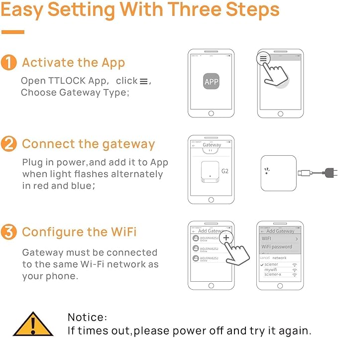- 【 Easy to Set Up】: WiFi gateway for smart lock is easy to connect and set up with your smart lock app within 2 minutes, It is recommended that the distance between the gateway and the smart door lock is no more than 32 ft (10 meters) to ensure a good signal connection. Please note that when adding a lock gateway to TTLock, your smart phone and the gateway must be connected to the same Wi-Fi network, and the gateway can pair as many locks as you want.