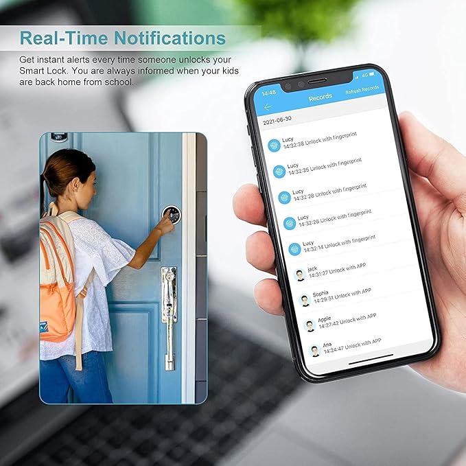 - 【Multiple Functions】Allows you to monitor the switch status of the door lock at anytime and anywhere, including viewing unlock records,remotely opening doors for friends or family,sharing e-keys or password,etc.It can also work with Alexa and Google Home to bring you a convenient smart home life.
