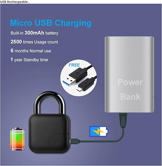 - [Long Standby & USB Charging Port] Fingerprint padlock with battery indicator, low power consumption and long standby time. 160mAh rechargeable lithium battery, charging for 2 hours,, can be unlocked more than 2000 times. If the battery is low or dead, the smart lock will remain locked. Just plug the included charging cable into a USB power source or use a portable power bank to charge it.