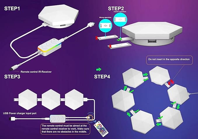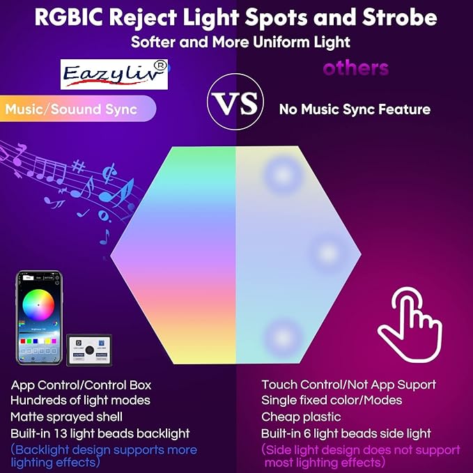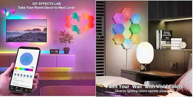 - 🟡 【VISUALIZE MUSIC】: A new way to visualize your tunes! With RGBIC technology, each edge has a different light color for more effects. The gaming hexagon he hex lights will follow the beat of music to change the color sensitively, add a captivating fantasy atmosphere to your favorite entertainment.