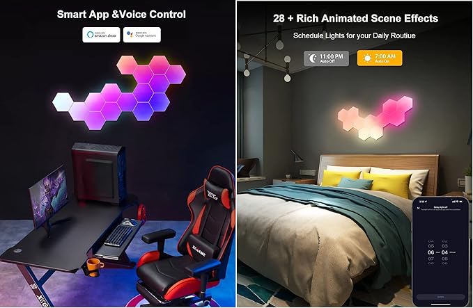 - 🔴 【SMART VOICE & APP CONTROL】: You can quickly voice control the color, brightness and dynamic effects of the hexagon lights by Wi-Fi binding Alexa or Google Assistant. Or control the night light through the APP. Provide more intelligence and convenience for your life.