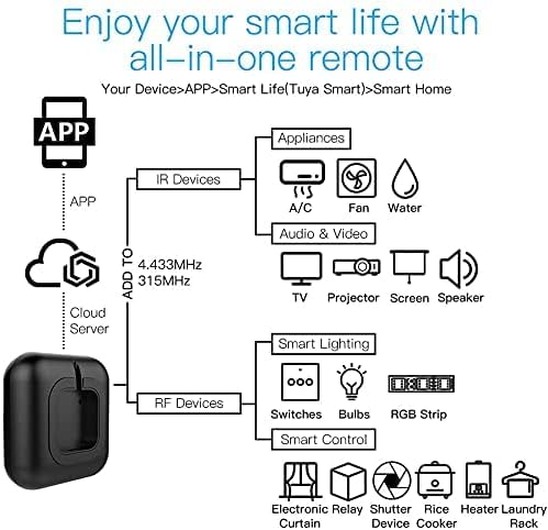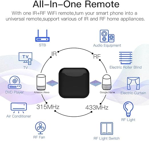 1. Wide application: this product can be use for activating air conditioners, TVs, fans, DVDs, STBs, TV BOXes and so on infrared and the RF applications such as RF light, RF switch, RF roller blinds and so on. 2. Multiple remote control RF, it gives the user a better experience for controlling 433MHz RF devices such as curtain, shades motor and so on. 3. Voice control: it can be controlled by your voice after you set it with Alexa, you can free your hands by remotely control and RF control. 4. Customized DIY copy function: you copy the same function from origi-nal remote if you cannot find the device brand on the APP. 5. When you need to away from home, you can control your appliances in advance and turn your phone into a universal remote in an easier way.