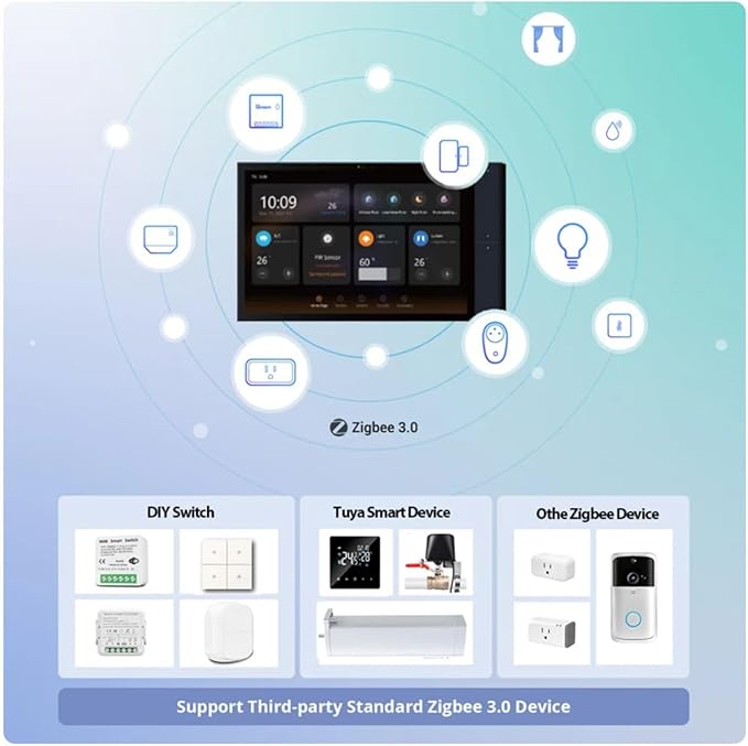 - 3. It is good substitute for ZigBee gateway function & powerfull control panel for tuya devices control. It can be used directly as gateway for adding Tuya ZigBee devices in App for intelligent controls, up to 100 ZigBee sub devices available for being added.