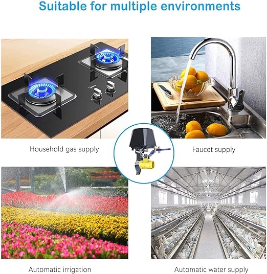 - [Timing control]: Set the time, the valve automatically opens or closes, Compatible with standard (Wi-Fi 2.4GHz) home automation systems.