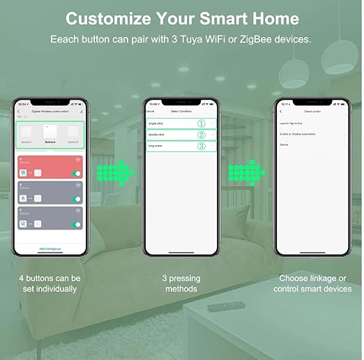 2.Three pairing modes for each button ,such as away mode,home mode,movie mode,etc.To create any smart automation as you want on your smart phone app to start your another intelligent lifestyle,no more voice command needed,no more time to open your app,only one touch required,when you are tired from one-day work.