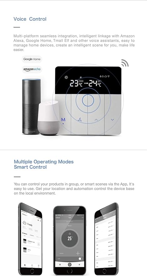 - Smart life / Tuya app for Android or IOS, Voice control, home temperature control, everything in your mobile app, integrated with amazon echo and google home, IFTTT, 5+2 six periods programmable maximize comfort and economy. It can be used by mobile app or manually by thermostat.