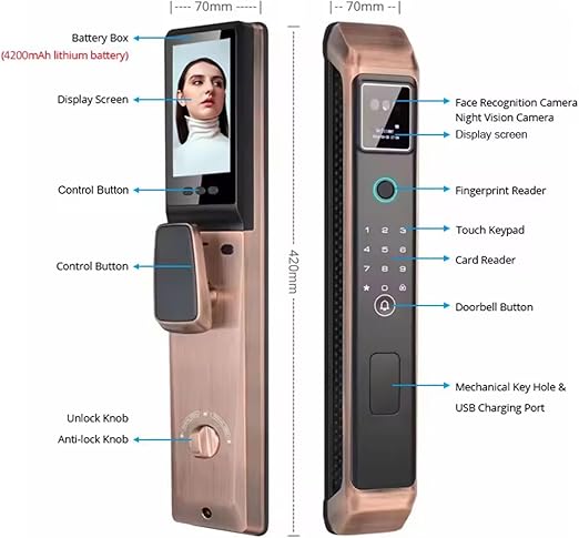 - Multiple Unlocking Methods- This smart lock has 6 door opening methods: 3D Face recognition,Biometric fingerprint unlocking, IC card, password, mechanical key and mobile phone APP to open the door, you can also view the unlocking history through the APP. Support TUYA /SMARTLIFE APP control function, you can connect to the phone via WiFi to unlock remotely and anti-theft hijacking functions, if someone damages the lock, the lock will automatically take photos and send to your mobile APP