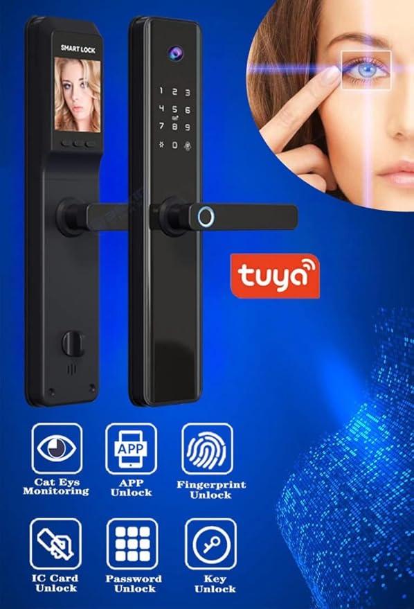 - 🔒 [5 unlocking methods & Tuya / Smartlife App]: remote unlocking by mobile phone when someone rings doorbell on lock, card unlocking, virtual password, key unlocking, fingerprint unlocking. Meet your needs for fingerprint locks in different situations. If someone outside maliciously damages the door lock, the camera will take a snapshot and an alarm sound, and the application will also receive the photo and save it. You can history of unlocking with picture in app.