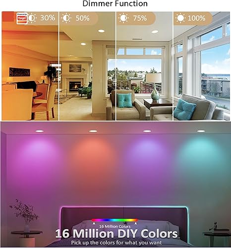 - 【Voice control】 Tuya smart downlights for ceiling are compatible with Alexa and Google Assistant. A simple dialogue can turn your LED Recessed Lighting on or off and adjust more colors. Support voice control by Alexa Echo / Google Home via SmartThings hub or Tuya Zigbee hub. NOTE: Zigbee Hub is not included.